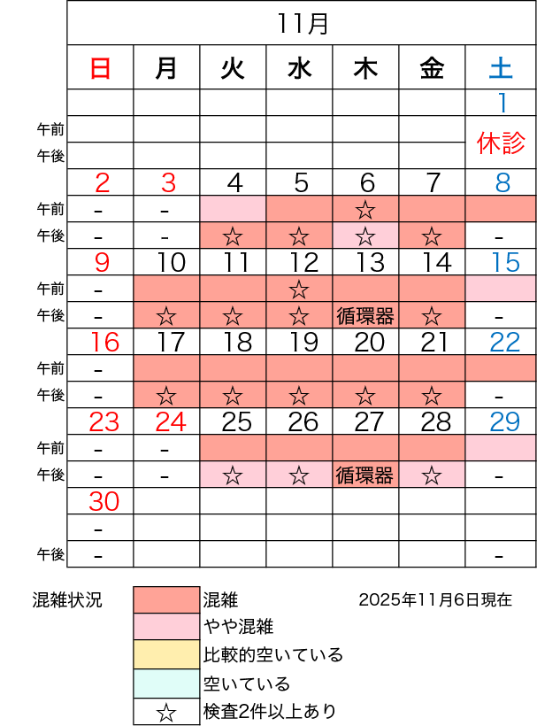 ご予約から予想される混雑状況です。 実際の混雑状況とは異なりますが、来院の参考にご利用ください。